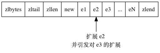正如扩展 e1 引发了对 e2 的扩展一样,扩展 e2 也会引发对 e3 的扩展,而扩展 e3 又会引发对 e4 的扩展……为了让每个节点的 previous_entry_length 属性都符合压缩列表对节点的要求,程序需要不断地对压缩列表执行空间重分配操作,直到 eN 为止。